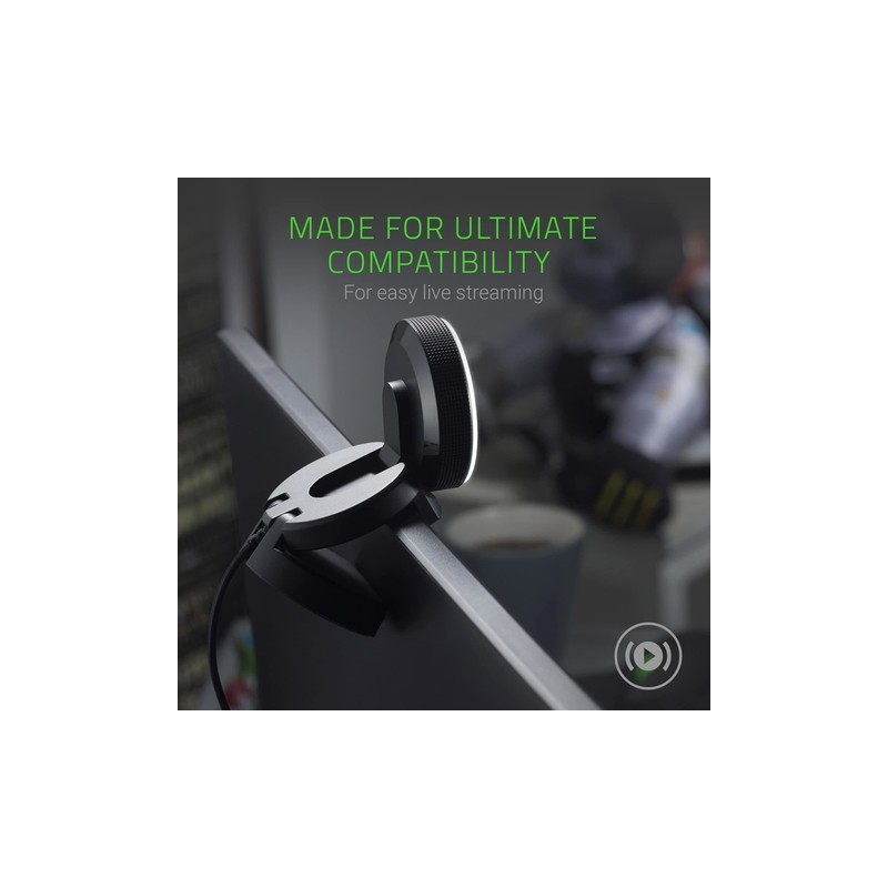 ENGANCHA, ILUMINA Y ACCIÓN Con el Razer Kiyo, tus fans o amigos están a un solo click. Con iluminación de estudio y capacidad full HD, es genial para retransmisiones y videollamadas, para que puedas estar conectado con la gente que forma parte de tuvida. - HIGH FPS HD VIDEO: 720p 60fps / 1080p 30fps - LUZ DE ANILLO AJUSTABLE: Elimina sombras ásperas y mantiene una fuente de luz uniforme en todo momento - PLUG AND PLAY: Compatible con plataformas populares como Open Broadcaster Software, XSplit y StreamLabs CONTROL TOTAL DE LA CÁMARA Disfruta de una personalización integral alternando entre enfoque automático y manual, y con la posibilidad de ajustar el brillo, el contraste, la saturación y el equilibrio de blancos. También podrás elegir entre diferentes ajustes de imagen predefinidos.